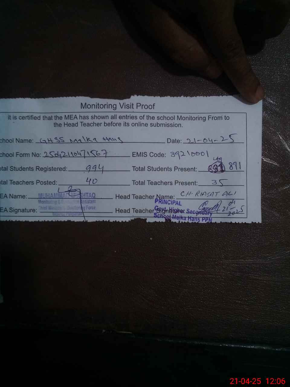| Attendance Register | Head Teacher | MEA with School | Visit Proof |