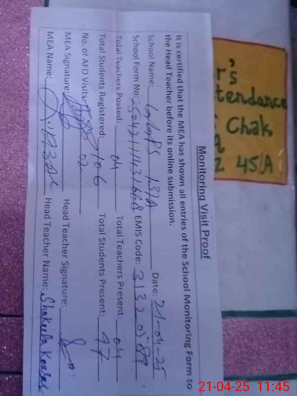 | EMIS Code: 31320589 | Name of School: GGPS CHAK NO.13/A | |||