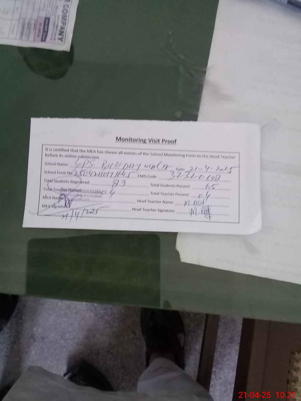 | Attendance Register | Head Teacher | MEA with School | Visit Proof |