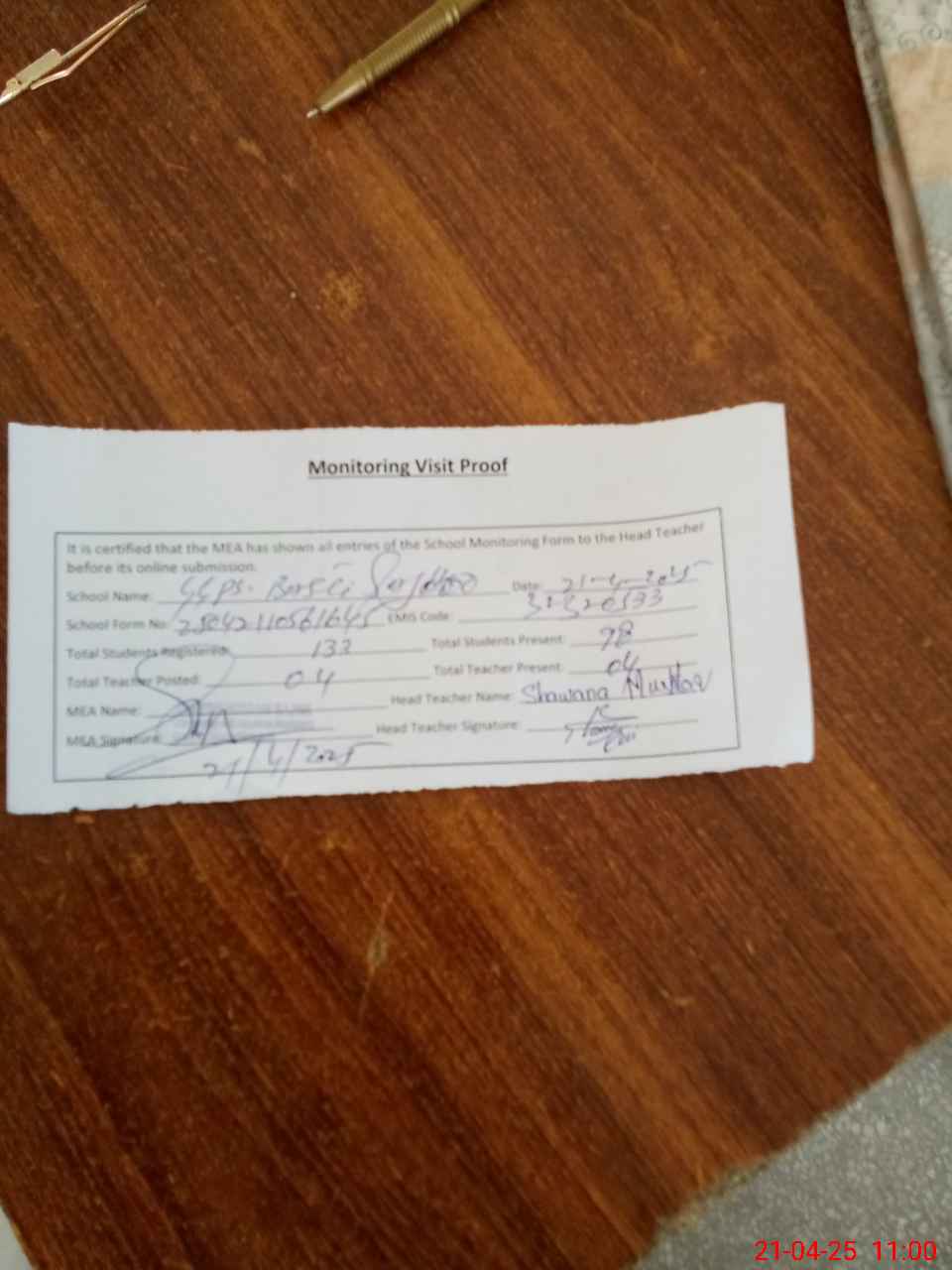 | Attendance Register | Head Teacher | MEA with School | Visit Proof |