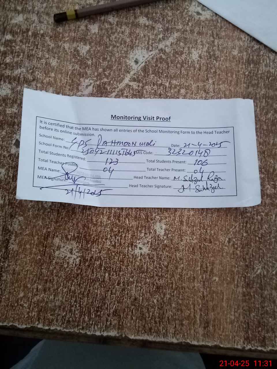 | Attendance Register | Head Teacher | MEA with School | Visit Proof |