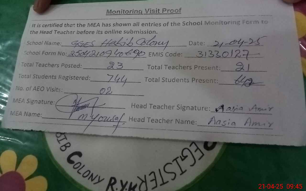 | EMIS Code: 31330127 | Name of School: GGES HABIB COLONY STREET NO. 7 | |||