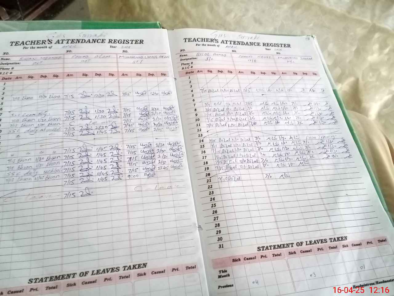 | CNIC | Full Name | Designation | R/C | Absence During Last Calender Month |