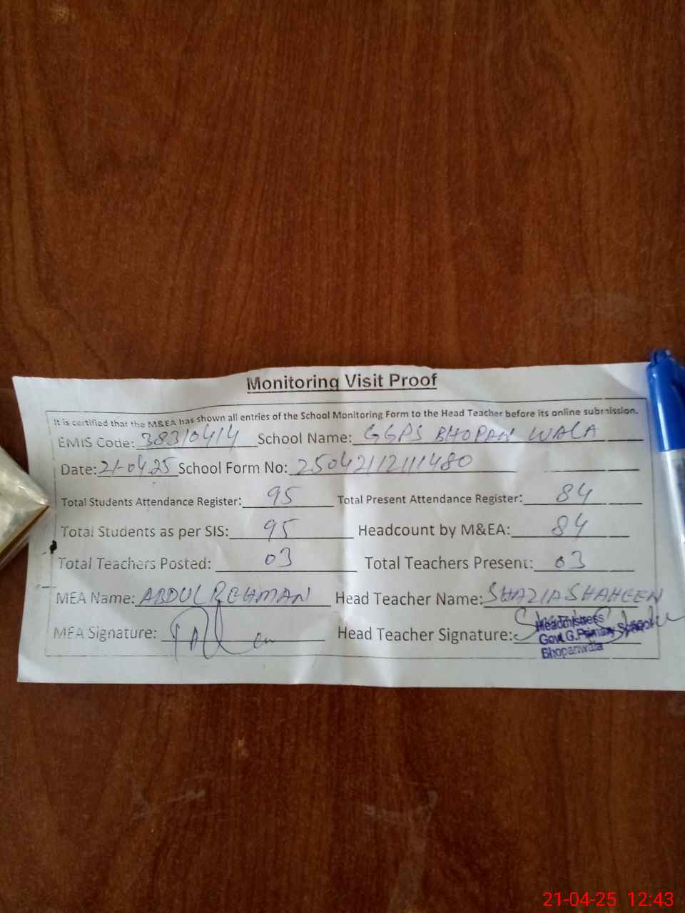 | Attendance Register | Head Teacher | MEA with School | Visit Proof |