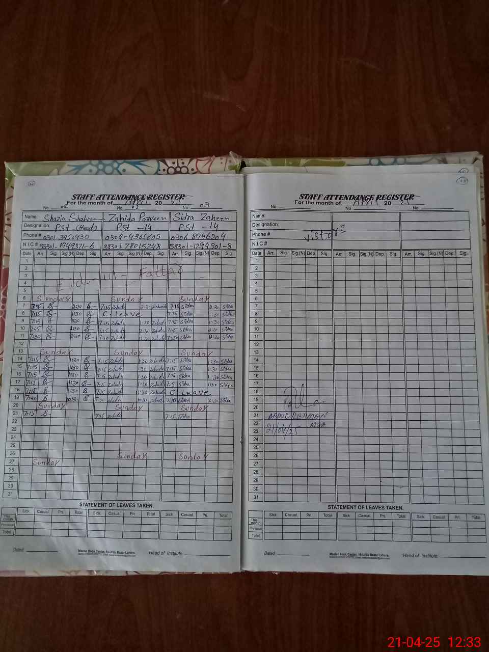| CNIC | Full Name | Designation | R/C | Absence During Last Calender Month |
