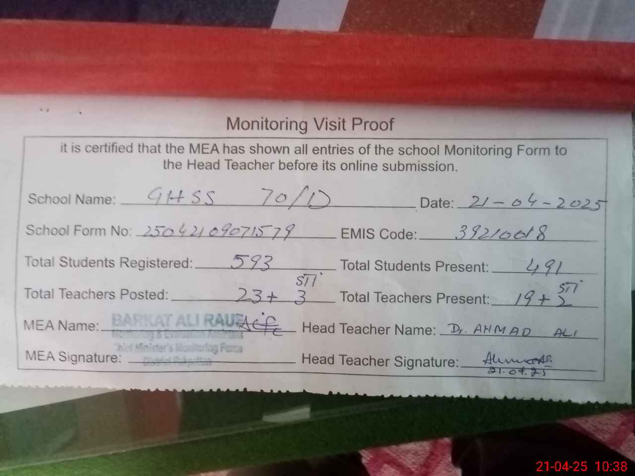 | Attendance Register | Head Teacher | MEA with School | Visit Proof |
