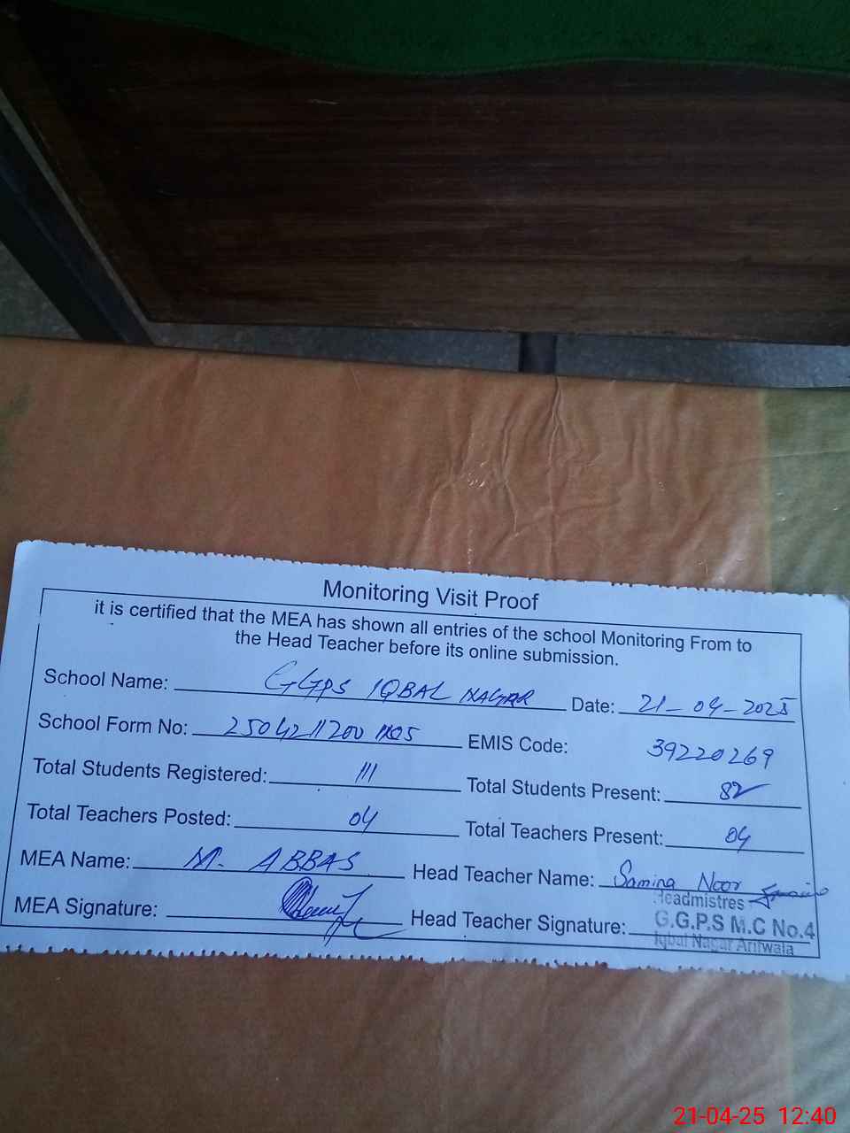 | EMIS Code: 39220269 | Name of School: GGPS MC NO. 4 IQBAL NAGAR ARIFWALA | |||