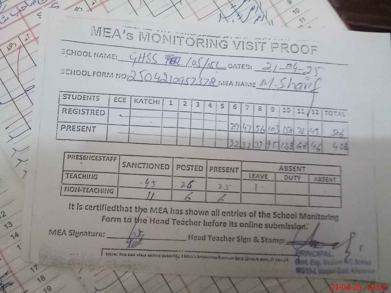 | Attendance Register | Head Teacher | MEA with School | Visit Proof |