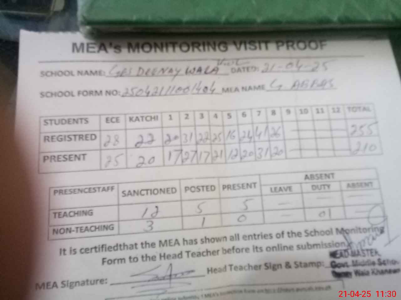 | Attendance Register | Head Teacher | MEA with School | Visit Proof |