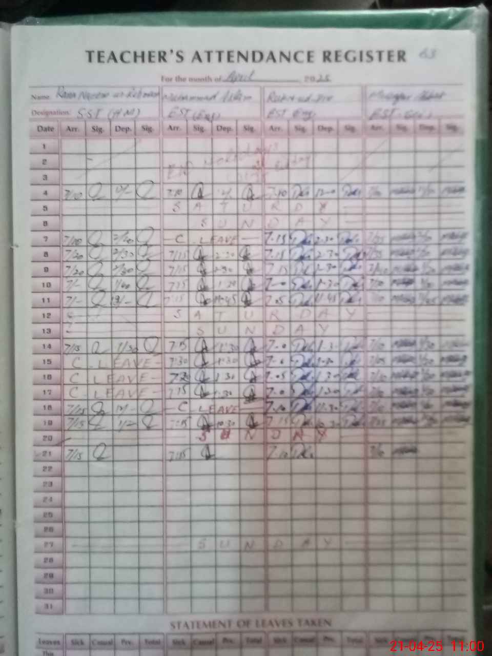 | Leave | Duty | Absent | Maternity | Medical | Ex- Pak |