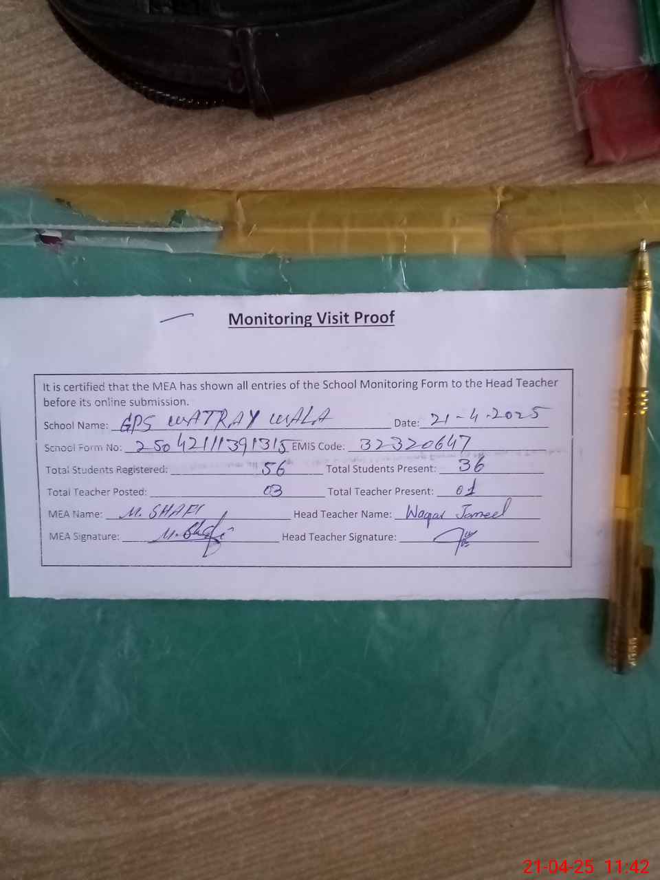 | Attendance Register | Head Teacher | MEA with School | Visit Proof |