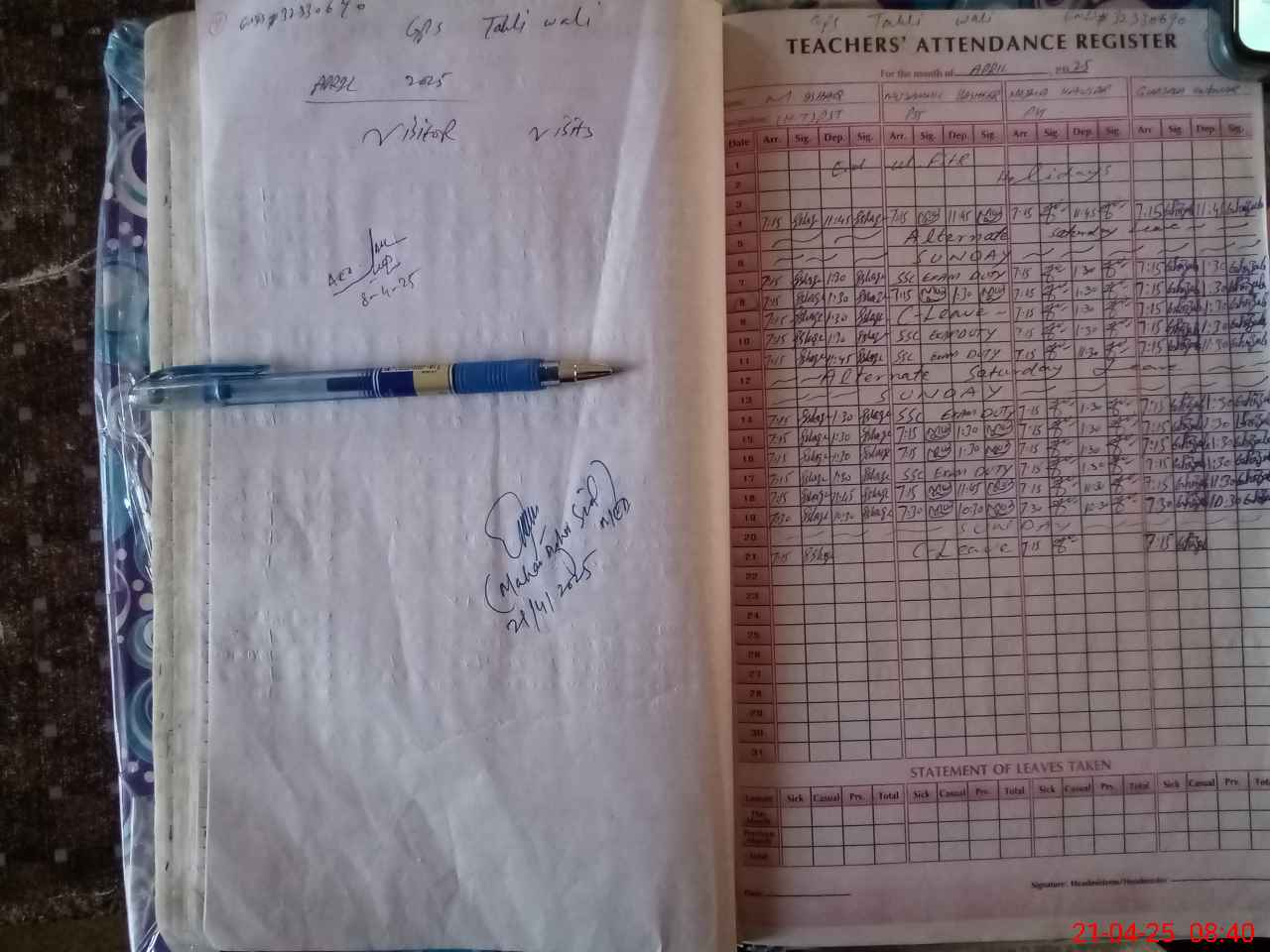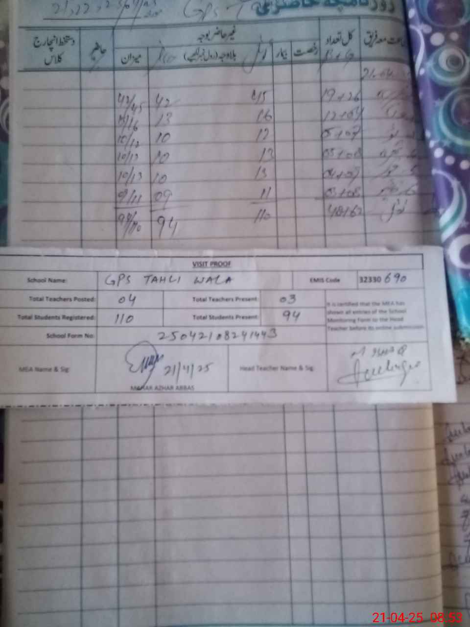 | Attendance Register | Head Teacher | MEA with School | Visit Proof |