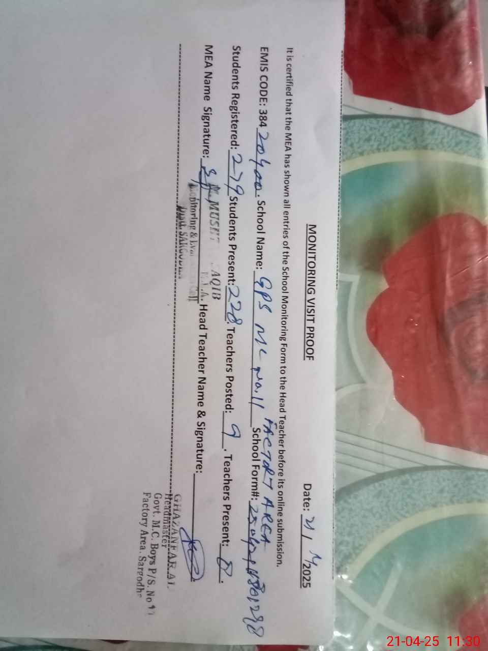 | EMIS Code: 38420400 | Name of School: GPS MC NO. 11 FACTORY AREA SARGODHA | |||