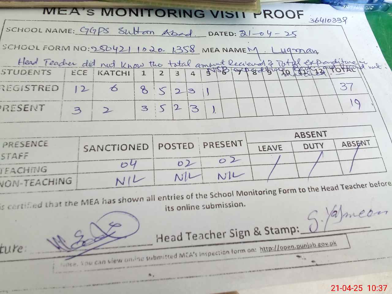 | EMIS Code: 36410339 | Name of School: GGPS SULTAN ABAD, KABIRWALA | |||
