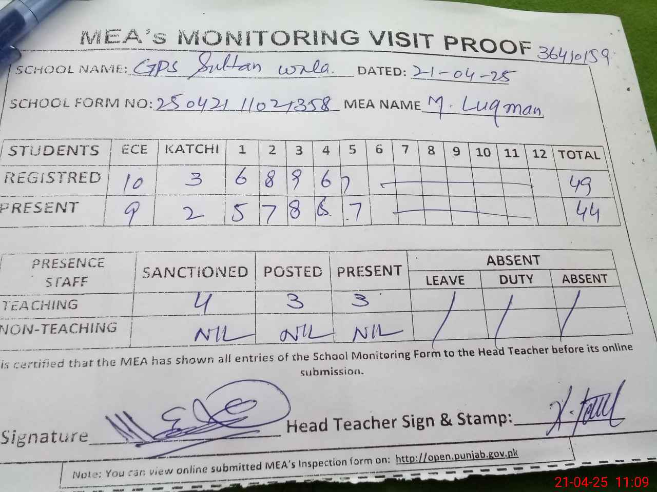 | Attendance Register | Head Teacher | MEA with School | Visit Proof |