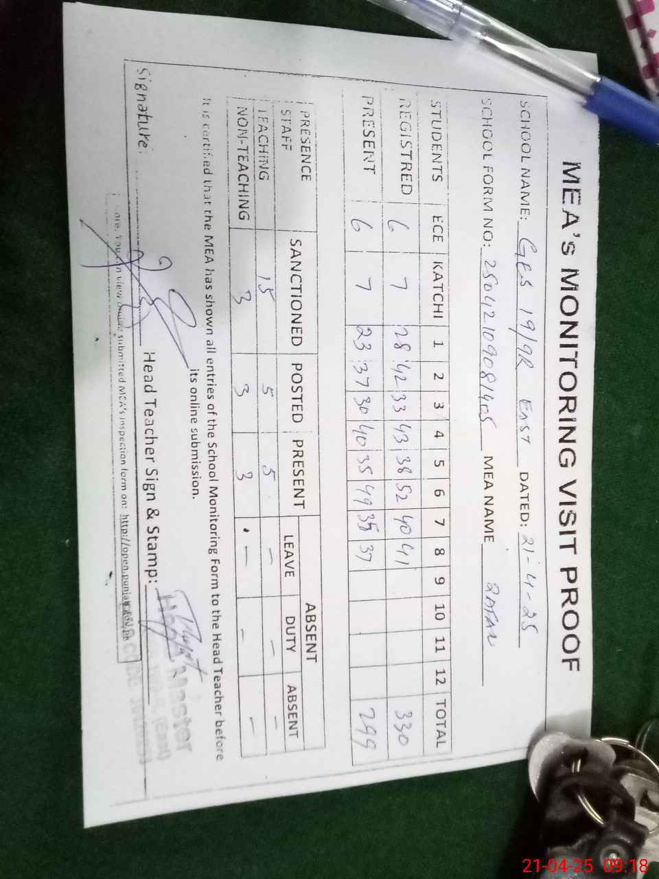 | Attendance Register | Head Teacher | MEA with School | Visit Proof |