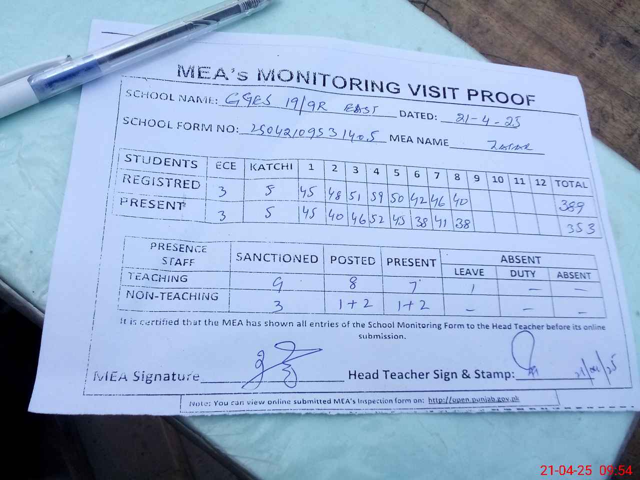 | Attendance Register | Head Teacher | MEA with School | Visit Proof |