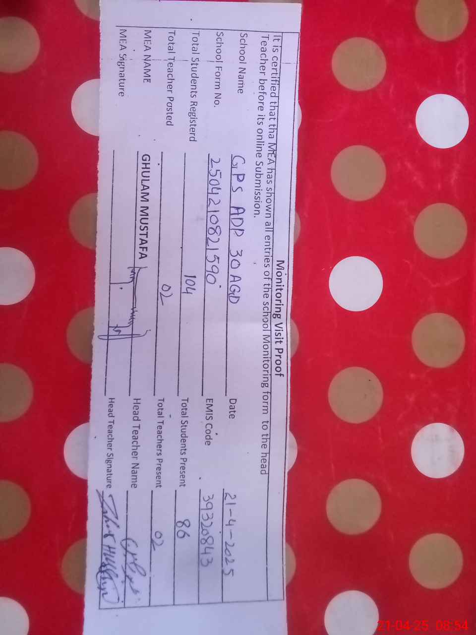 | Attendance Register | Head Teacher | MEA with School | Visit Proof |