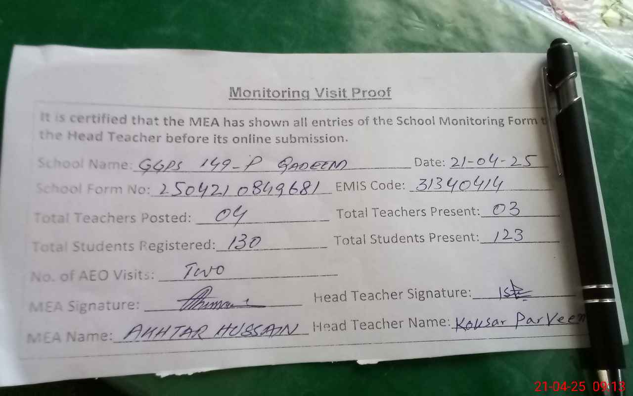 | Attendance Register | Head Teacher | MEA with School | Visit Proof |