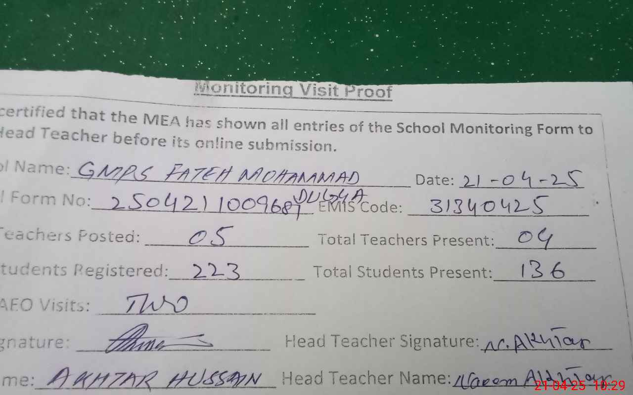 | EMIS Code: 31340425 | Name of School: GMPS FATEH MUHAMMAD DUGGA | |||