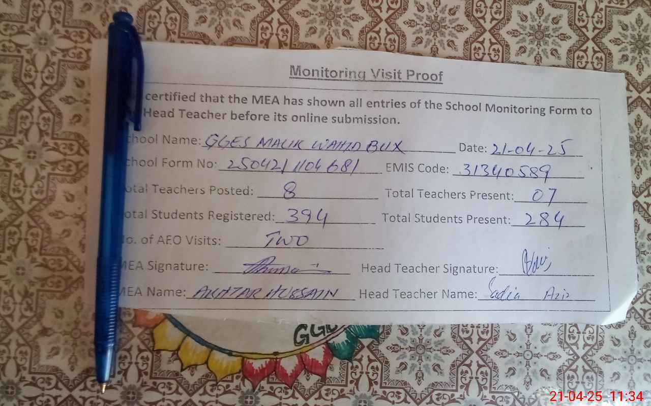 | EMIS Code: 31340589 | Name of School: GGES MALIK WAHID BUX | |||