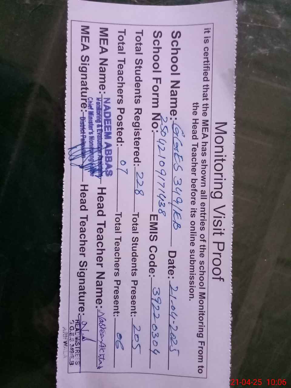 | Certified that this School was Inspected by the Undersigned MEA/DMO Today and the Information Stated Above is as Per Record. | |||||