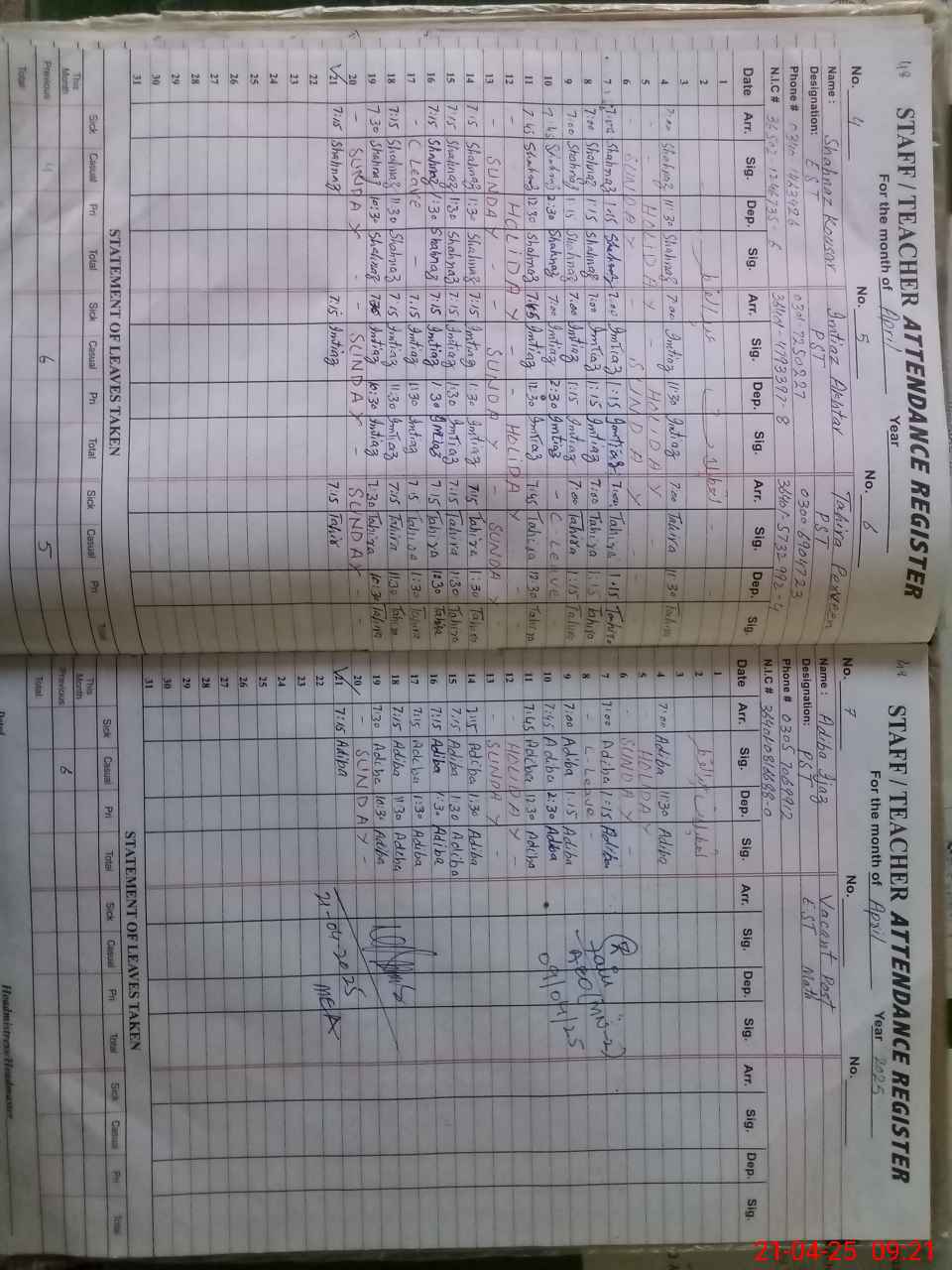 | Name: NA**** AK**** Designation: (School Headmaster's/Headmistress's) SST (GENERAL) Phone/Cell Number: 03**** |