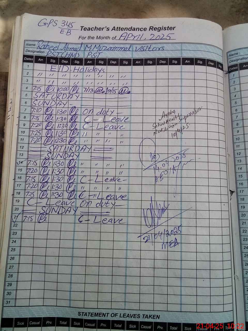 | Remarks (Use Separate Page if Required): Note Teacher Muzamil Aslam PST was found absent without sanctioned leave | |||||