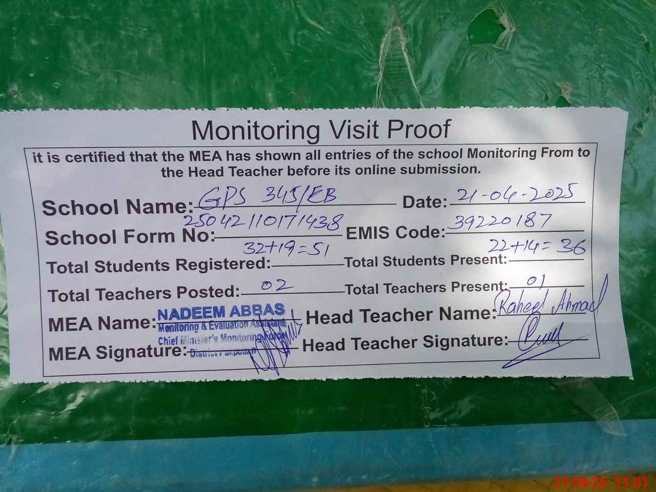 | EMIS Code: 39220187 | Name of School: GPS 345 EB ARIFWALA | |||