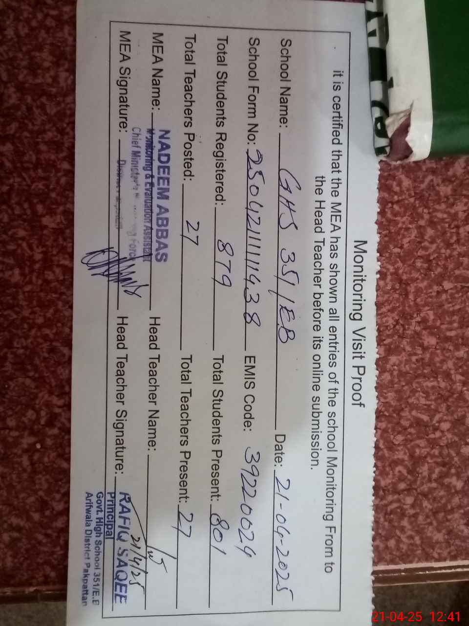 | Certified that this School was Inspected by the Undersigned MEA/DMO Today and the Information Stated Above is as Per Record. | |||||