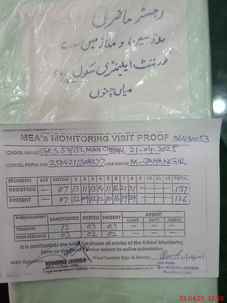 | EMIS Code: 36430053 | Name of School: GES 54/15-L, MIAN CHANNU | |||