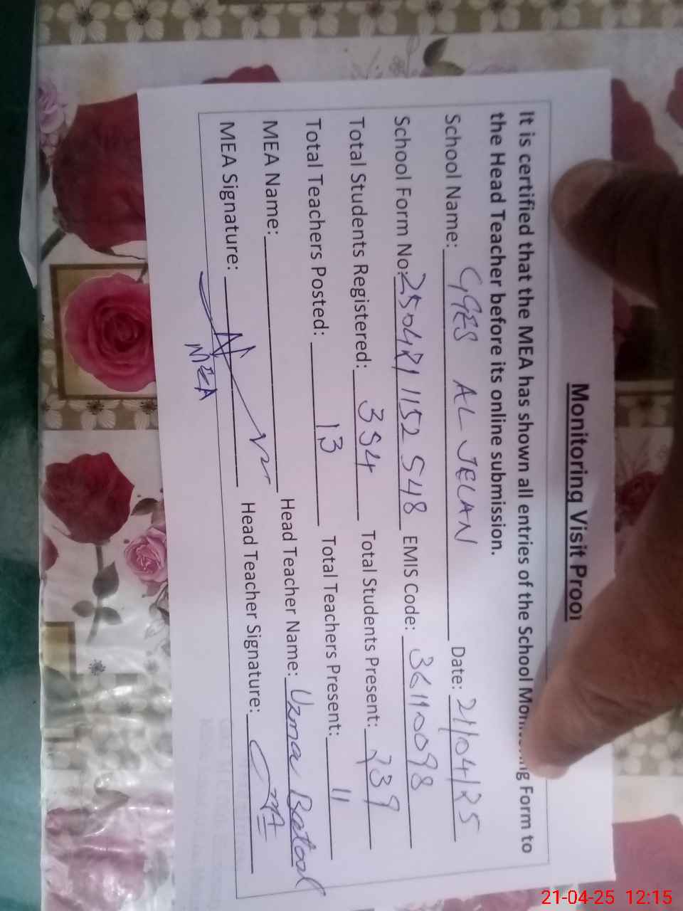 | EMIS Code: 36110098 | Name of School: GGES MC AL-JEELAN MULTAN | |||