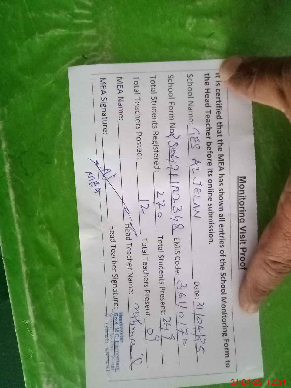 | Attendance Register | Head Teacher | MEA with School | Visit Proof |