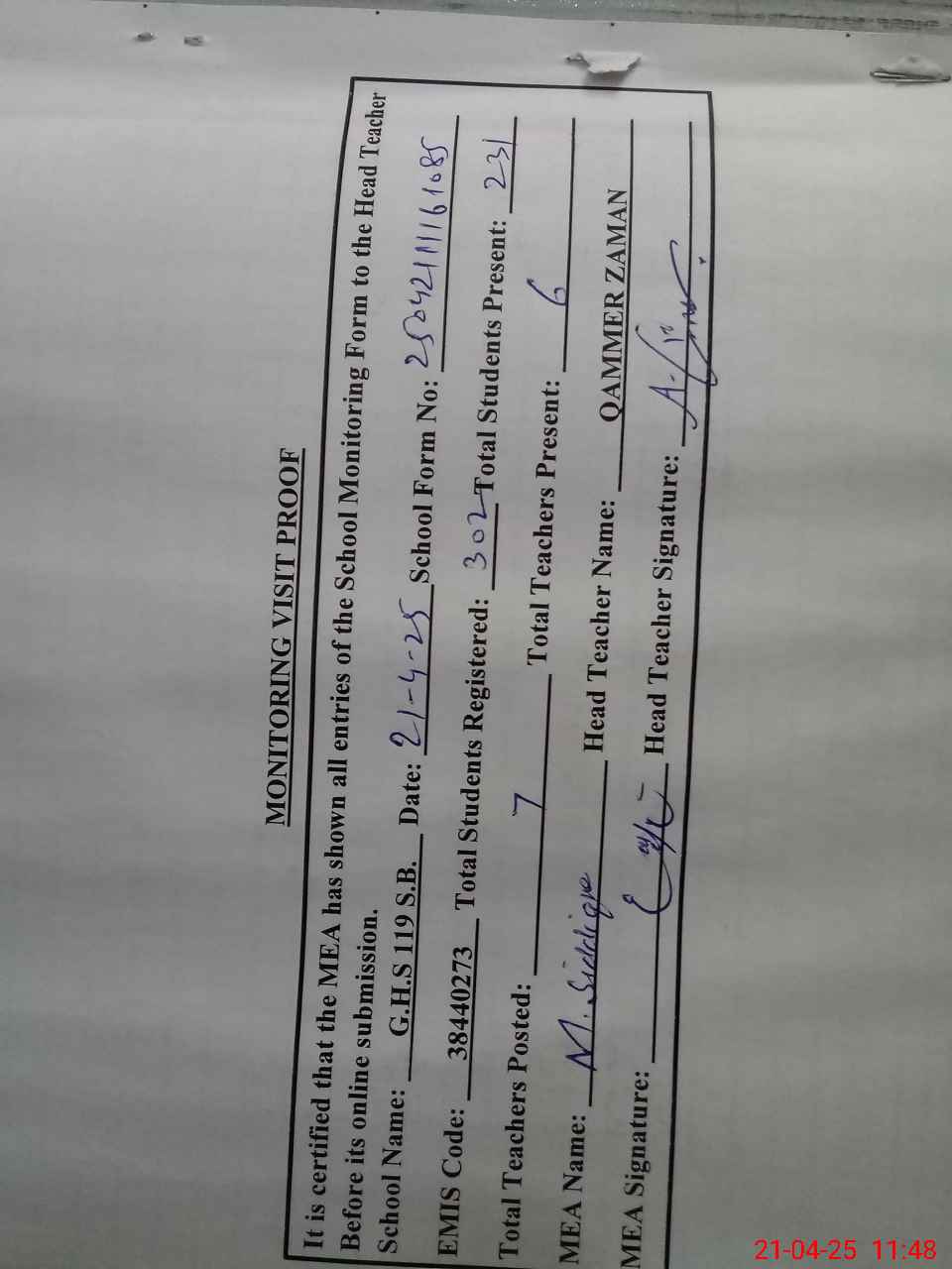 | Attendance Register | Head Teacher | MEA with School | Visit Proof |