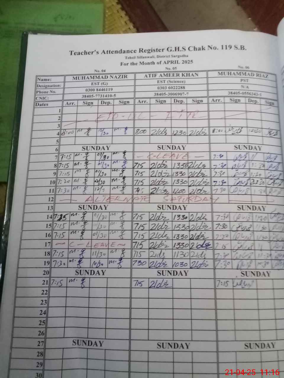 | CNIC | Full Name | Designation | R/C | Absence during last cal. month |