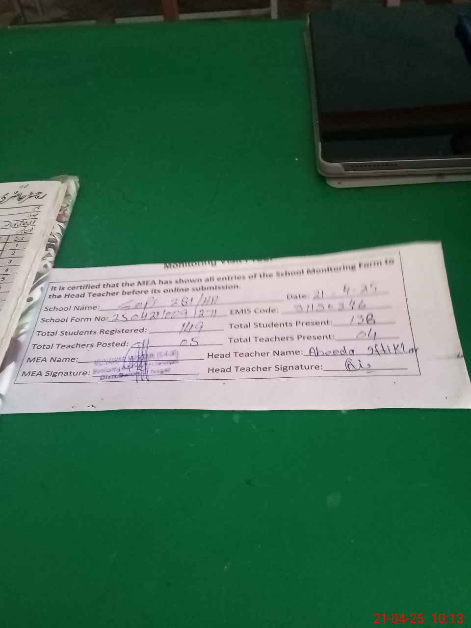 | Attendance Register | Head Teacher | MEA with School | Visit Proof |