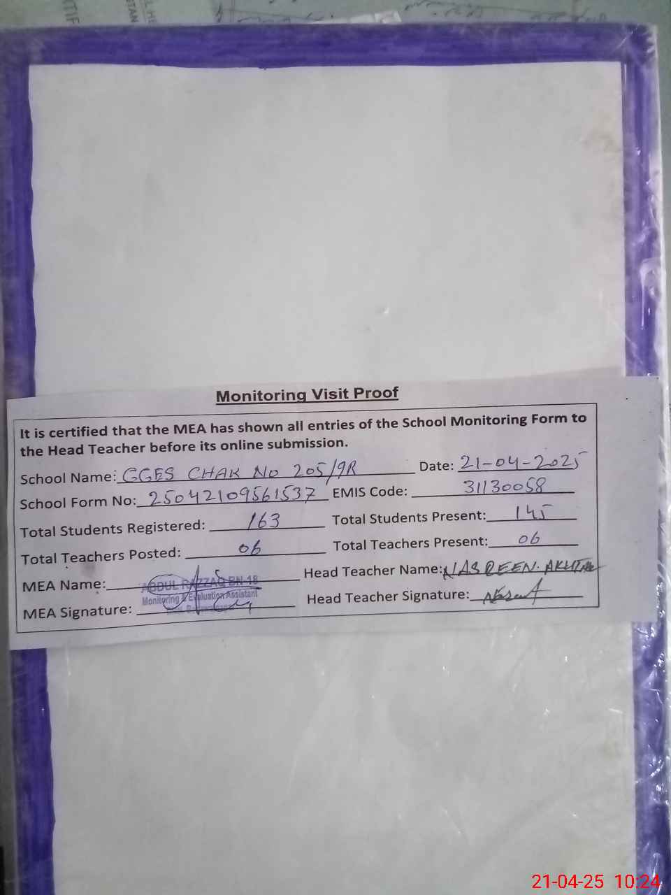 | EMIS Code: 31130058 | Name of School: GGES CHAK 205/9-R | |||