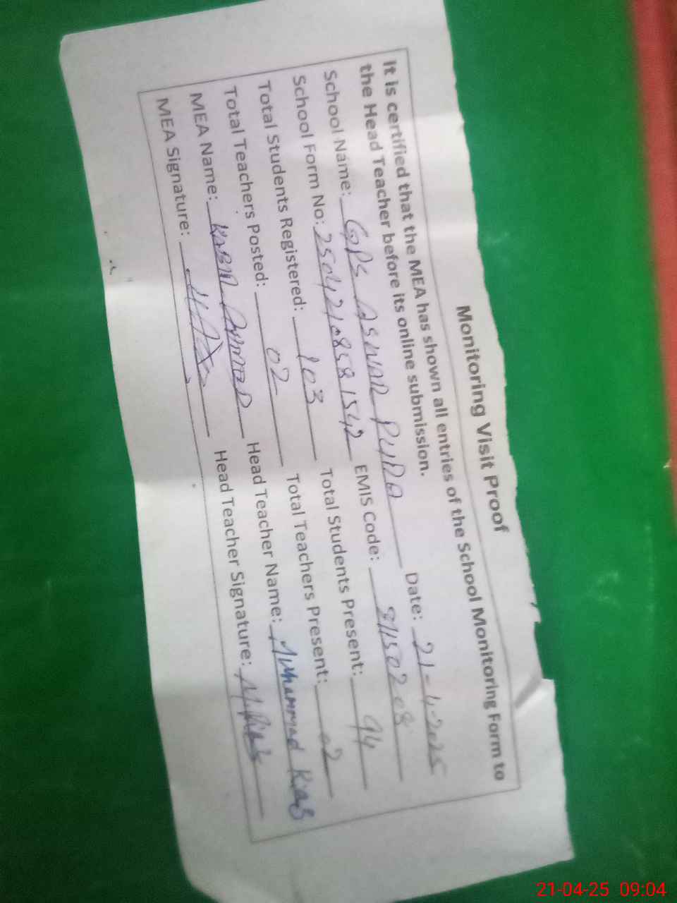 | Attendance Register | Head Teacher | MEA with School | Visit Proof |