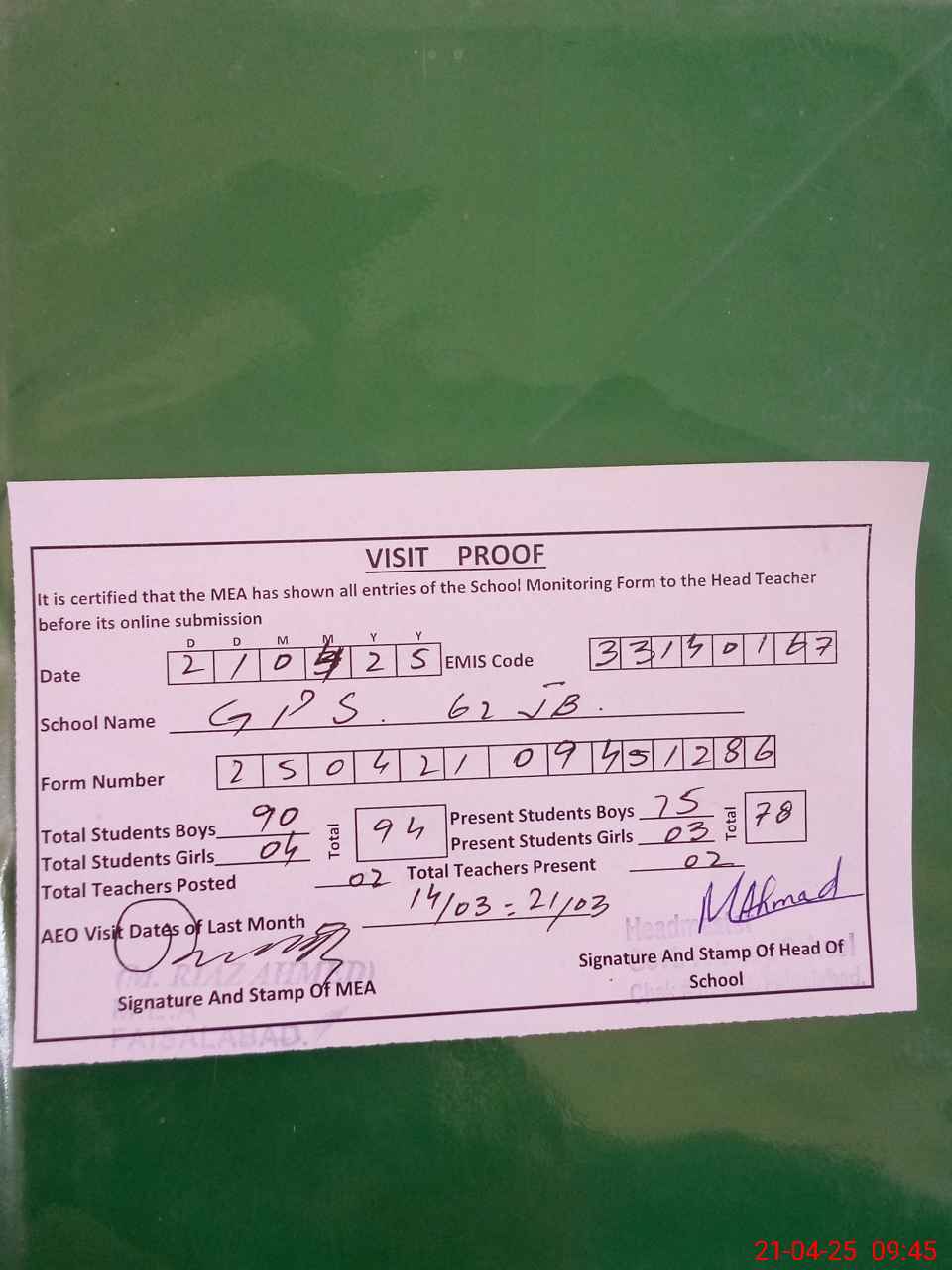 | EMIS Code: 33140167 | Name of School: GPS CHAK 62 JB | |||