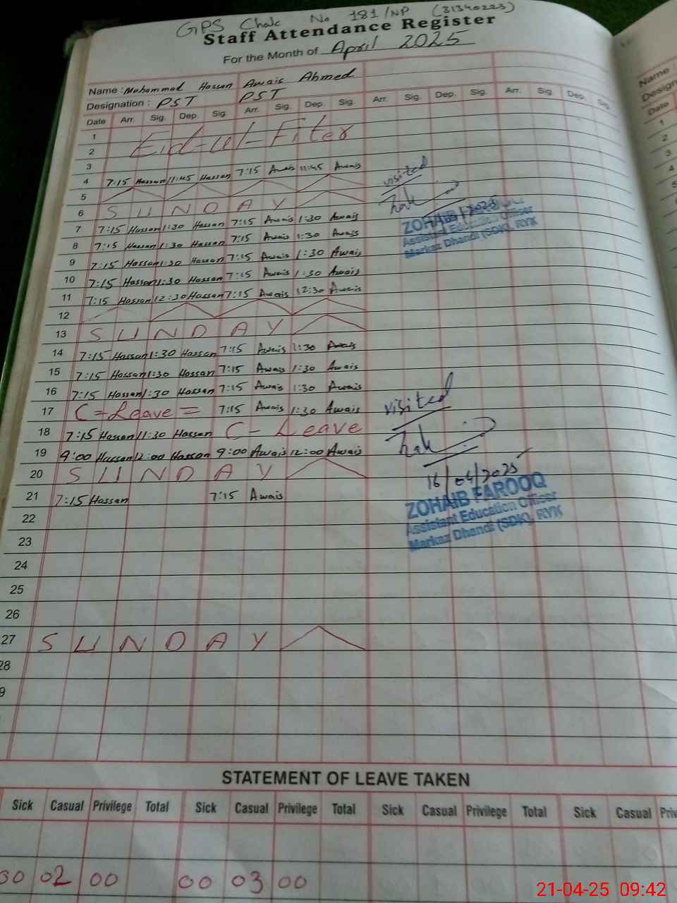 | CNIC | Full Name | Designation | R/C | Absence During Last Calender Month |