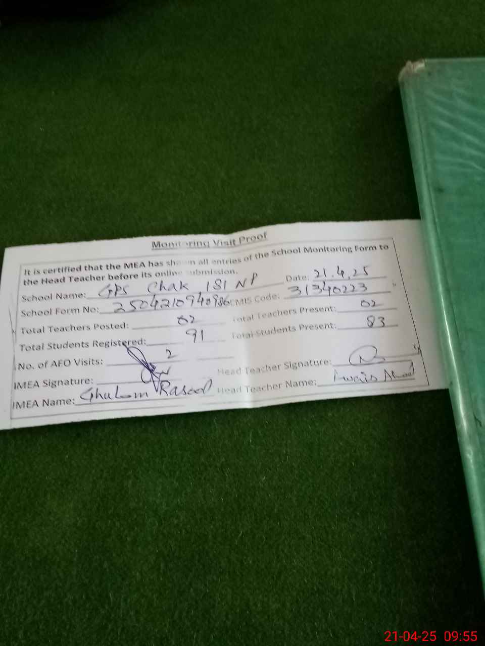 | Attendance Register | Head Teacher | MEA with School | Visit Proof |