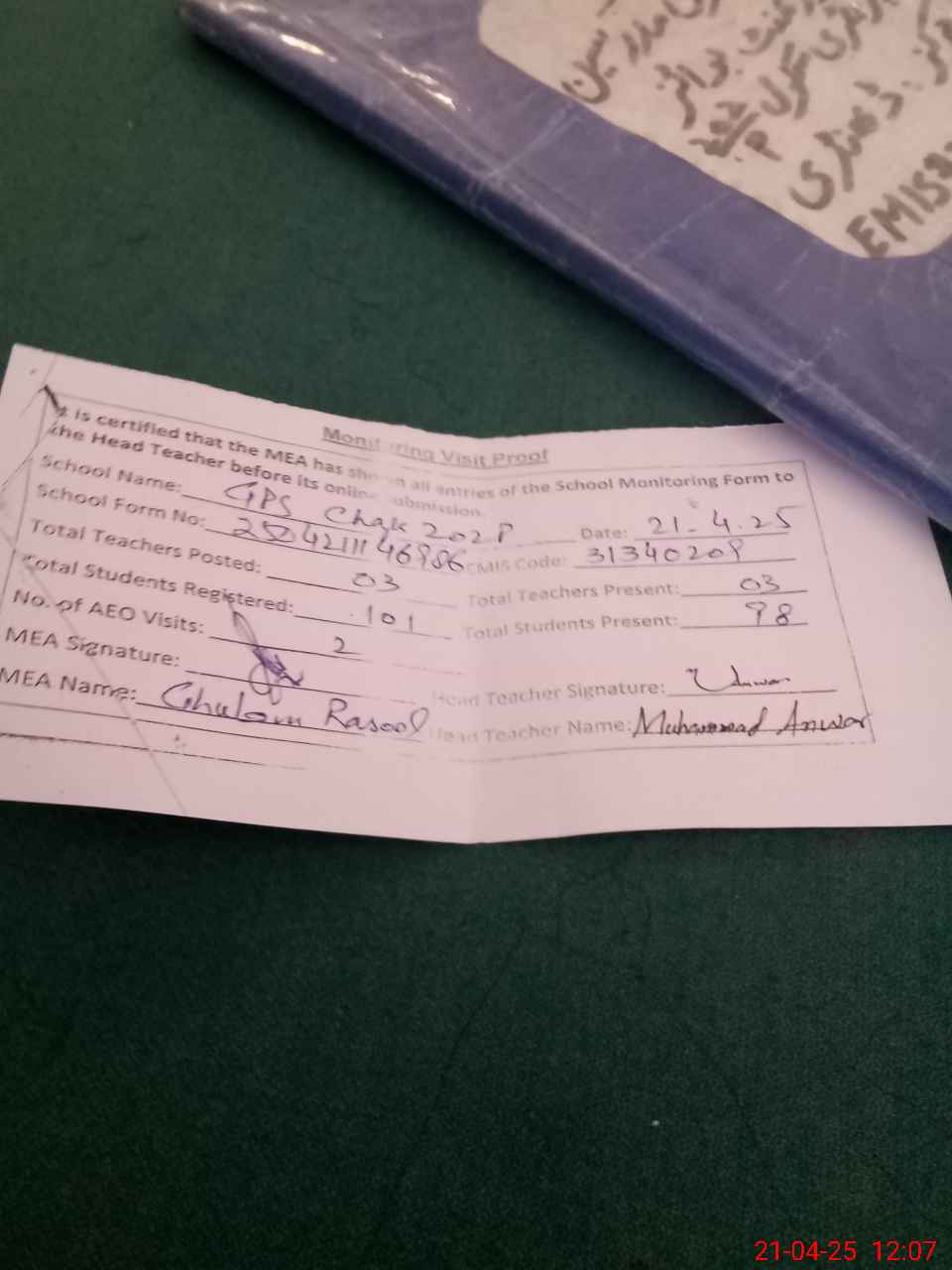 | Attendance Register | Head Teacher | MEA with School | Visit Proof |