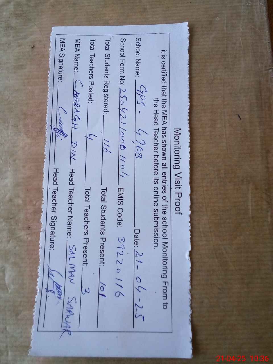 | Attendance Register | Head Teacher | MEA with School | Visit Proof |