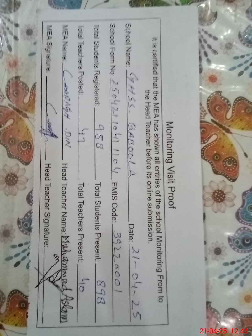| Attendance Register | Head Teacher | MEA with School | Visit Proof |