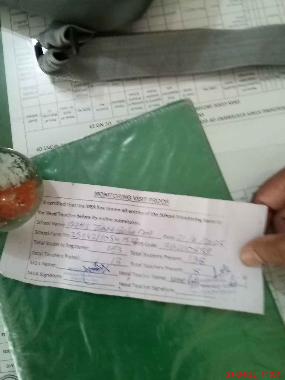 | Attendance Register | Head Teacher | MEA with School | Visit Proof |