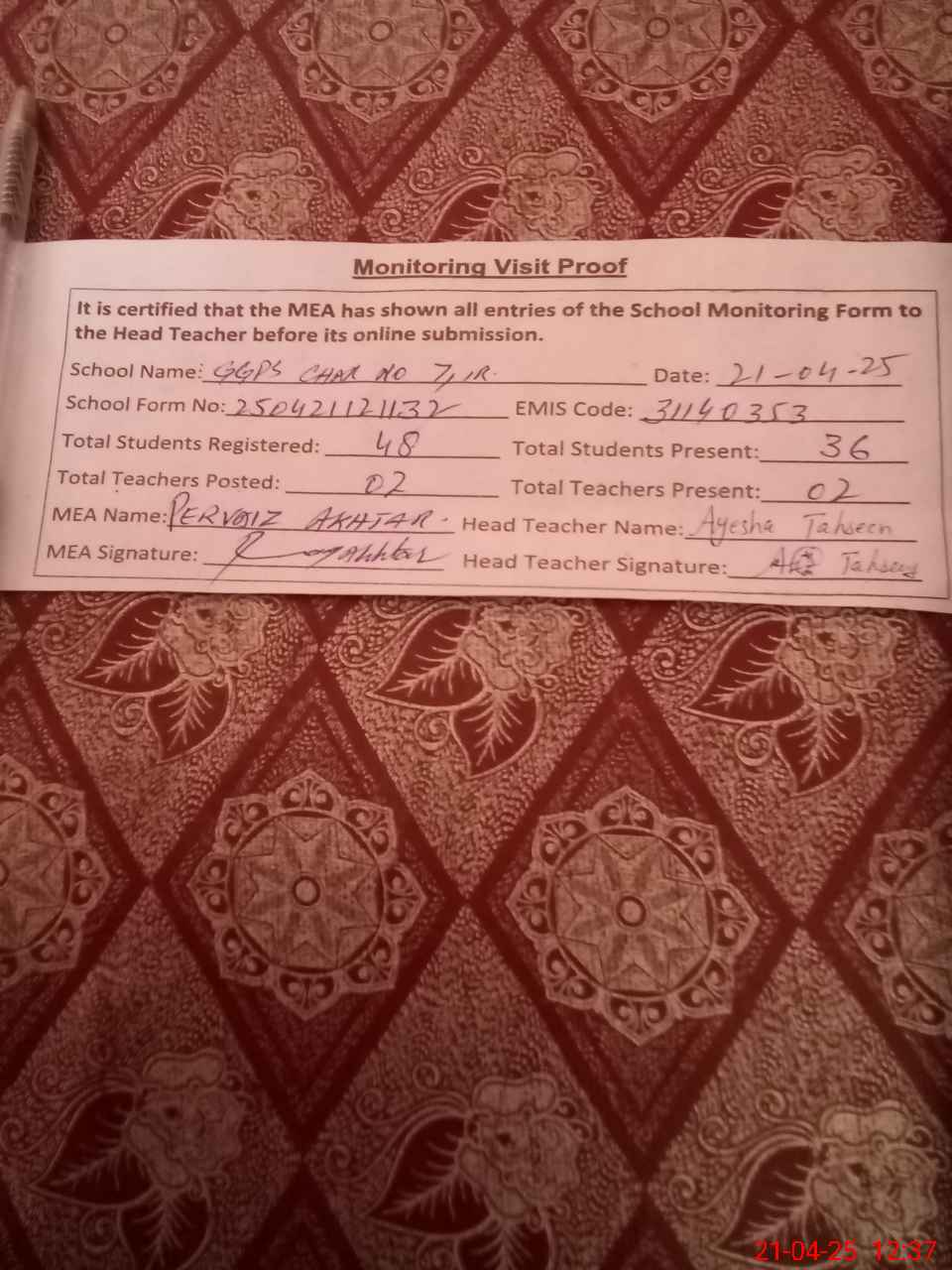 | Attendance Register | Head Teacher | MEA with School | Visit Proof |