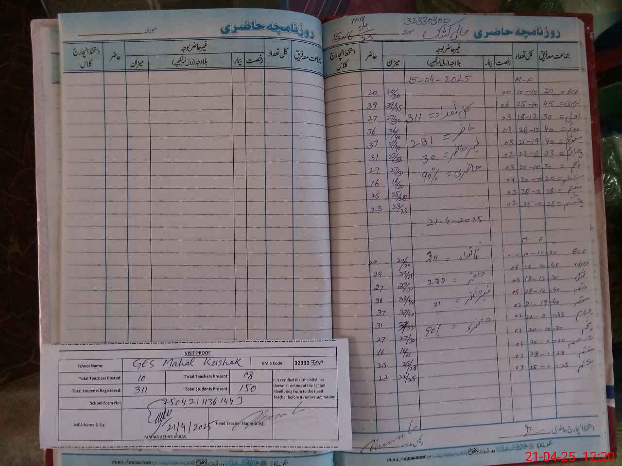 | Remarks (Use Separate Page if Required): Mr Muhammad Adeel Mehdi 3230490757481 has been working in this school to take load of extra classes since 1st March 2025 Huge difference in Roznamcha and physical attendance of students In Roznamcha present students are 280 but physical count is only 150 | |||||