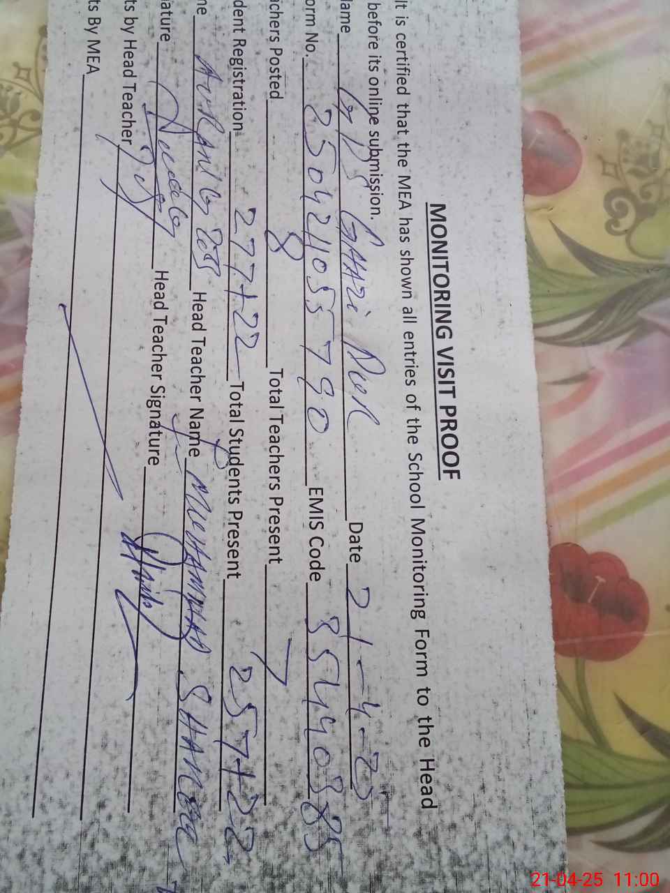 | Attendance Register | Head Teacher | MEA with School | Visit Proof |