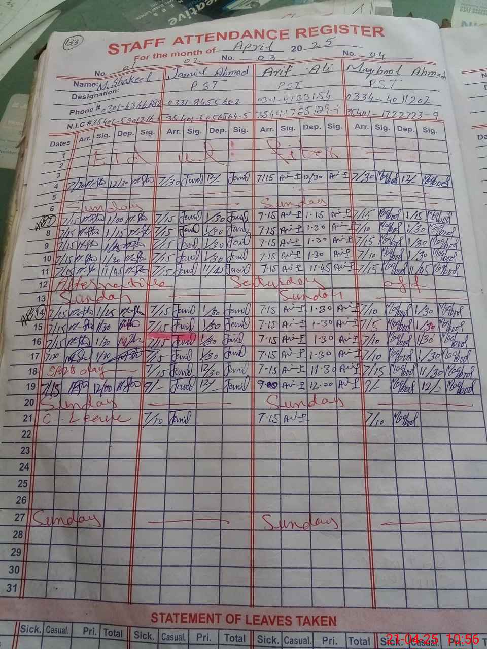 | CNIC | Full Name | Designation | R/C | Absence During Last Calender Month |