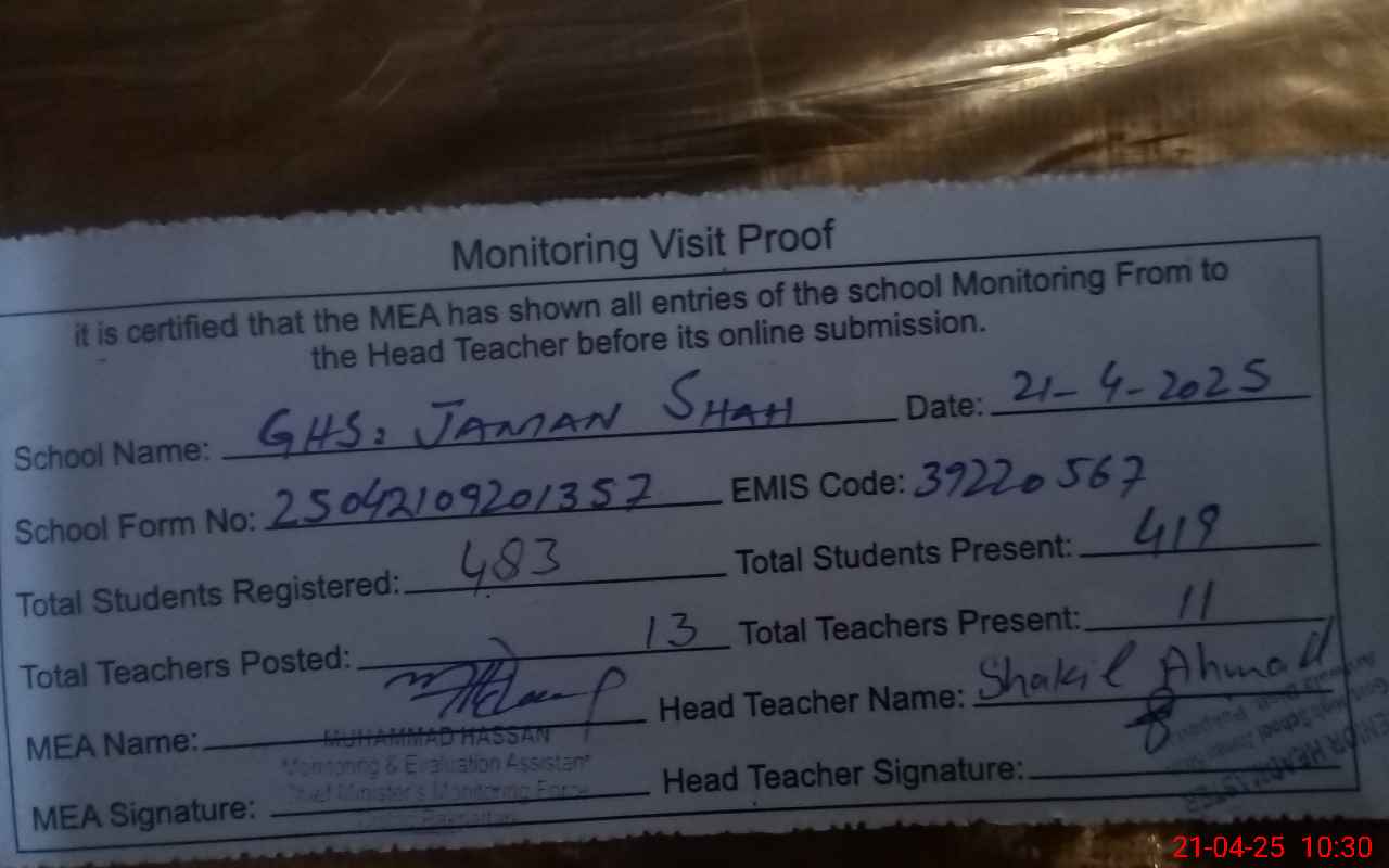 | EMIS Code: 39220567 | Name of School: GHS JUMAN SHAH | |||